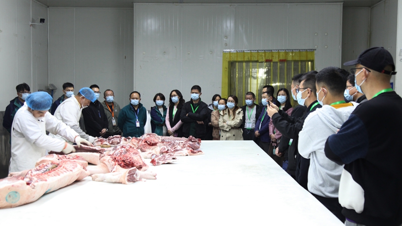 在豬肉分割車間,督查組成員現場觀看了工作人員剔骨、切塊、修整等規范操作,并聽取了關于豬肉品質管控、分割質量把控、食品安全規范及設施設備提升等情況的介紹。