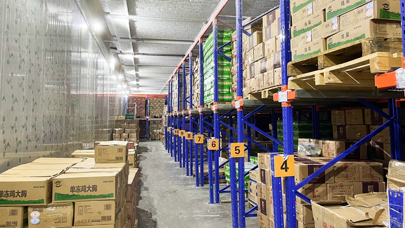 一扇扇厚重的冷庫大門前,4℃、-18.2℃、-24.1℃……各顯示屏上精準顯示著門內(nèi)各自的溫度。打開門,白色冷霧縹緲,儲物架上一箱箱凍品標簽明顯、排列整齊。走近了聞,是干爽冷冽的涼氣,沒有一點異味。“我們的冷庫在區(qū)域內(nèi)行業(yè)領(lǐng)先。”諸暨分公司倉儲部負責人邊晨升自豪地說。2022年,諸暨分公司新建冷藏冷凍庫5500立方米,并搭配智能監(jiān)控與移動端操作系統(tǒng),進一步提升了公司倉儲條件,實現(xiàn)了凍禽、水產(chǎn)、蔬菜等的專倉儲存,有效避免串味與不當儲存造成的損耗問題。冷庫還專門設(shè)置了轉(zhuǎn)運倉,可以臨時存放即將運出的貨品,做好全程冷鏈的銜接。