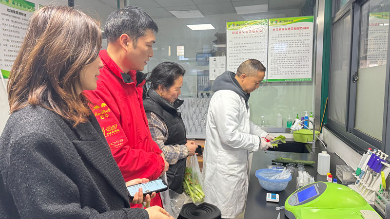 在食品安全檢測區,技術人員現場演示蔬菜農藥殘留、肉類水分含量等快速檢測流程,吸引眾多市民圍觀。消費者可免費送檢采購的農產品,20分鐘即可獲取檢測結果,進一步筑牢食品安全防線。市場結合媒體曝光的不合格產品進行逐個排查,告知商戶在日常經營中加以防范并正確處置,確保消費者買得放心、用得舒心、吃得安心。