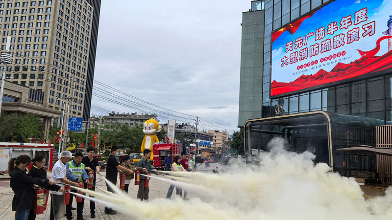 隨著消防警報響起,演練正式拉開帷幕。參演人員迅速進入應急狀態,按照預定疏散方案,用濕毛巾捂住口鼻,沿安全指示標識快速有序撤離。與此同時,接到警報的商場自有消防車第一時間出動,迅速抵達模擬起火點,熟練操作高壓水槍實施滅火作業,整個過程緊張有序。